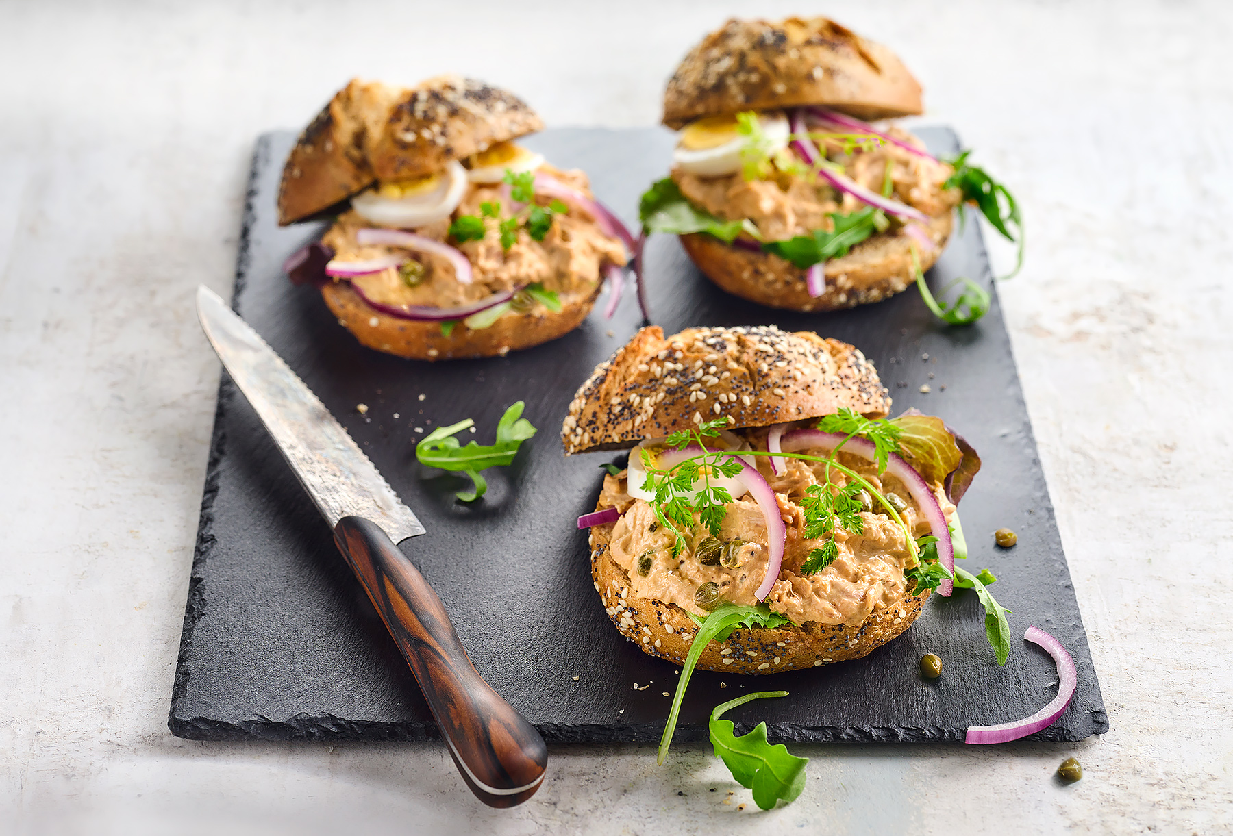 - Snijd de pistolets doormidden en smeer onderaan wat Délino Andalouse. Presenteer daarop wat jonge sla en daarop de tonijnsalade. Werk af met plakjes ei, wat rode ajuin en jonge kervelscheuten. Leg dicht.
